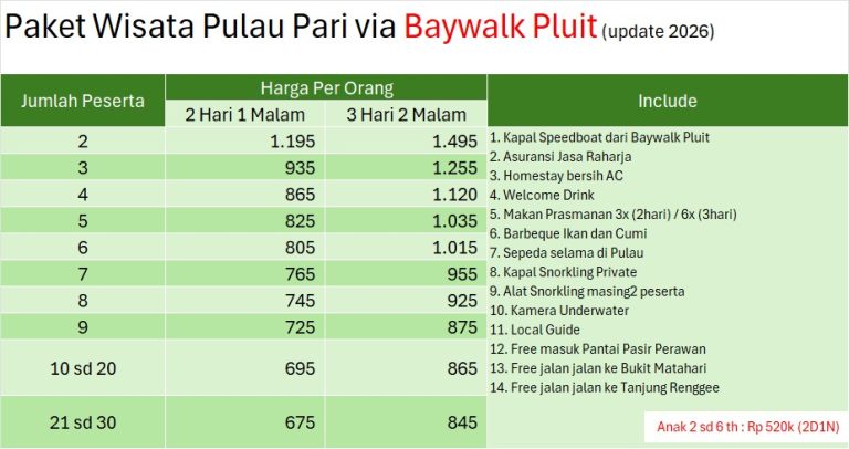 Pulau Pari adalah destinasi wisata bahari di Kepulauan Seribu yang terkenal dengan pantai berpasir putih bersih seperti Pantai Pasir Perawan, air laut jernih kehijauan, serta kehidupan bawah lautnya yang kaya (ikan badut, karang) cocok untuk snorkeling dan diving. Keunikan lainnya adalah suasana alami yang masih terjaga, dapat dijelajahi dengan sepeda, memiliki hutan bakau untuk konservasi, dan spot Sunrise/Sunset terbaik di Dermaga Bukit Matahari, menjadikannya surga kecil dekat Jakarta yang menarik untuk liburan singkat.